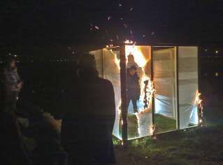 Simultaneously with the opening were shooting of the videofilm of the same name, in which the Evangely and the artists girlfriend (as designated) was the main character's, the audience - extras, and then two guerrillas came to the exhibition. In a previous art work (used in "Altar of cosmism") guerrillas acquired fire in the forest in the cone (referring to the symbolic structure of the stupa - a round heaven and square dome bowl celestial waters). As a result, the girl (Muse) goes off into the darkness with the guerrillas, and the artist is burned in the cube.
